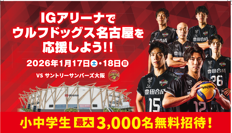 SVリーグ初となる、国内最大級の収容人数を誇る「IGアリーナ」にてウルフドッグス名古屋 vs サントリーサンバーズ大阪のホームゲームを開催いたします。