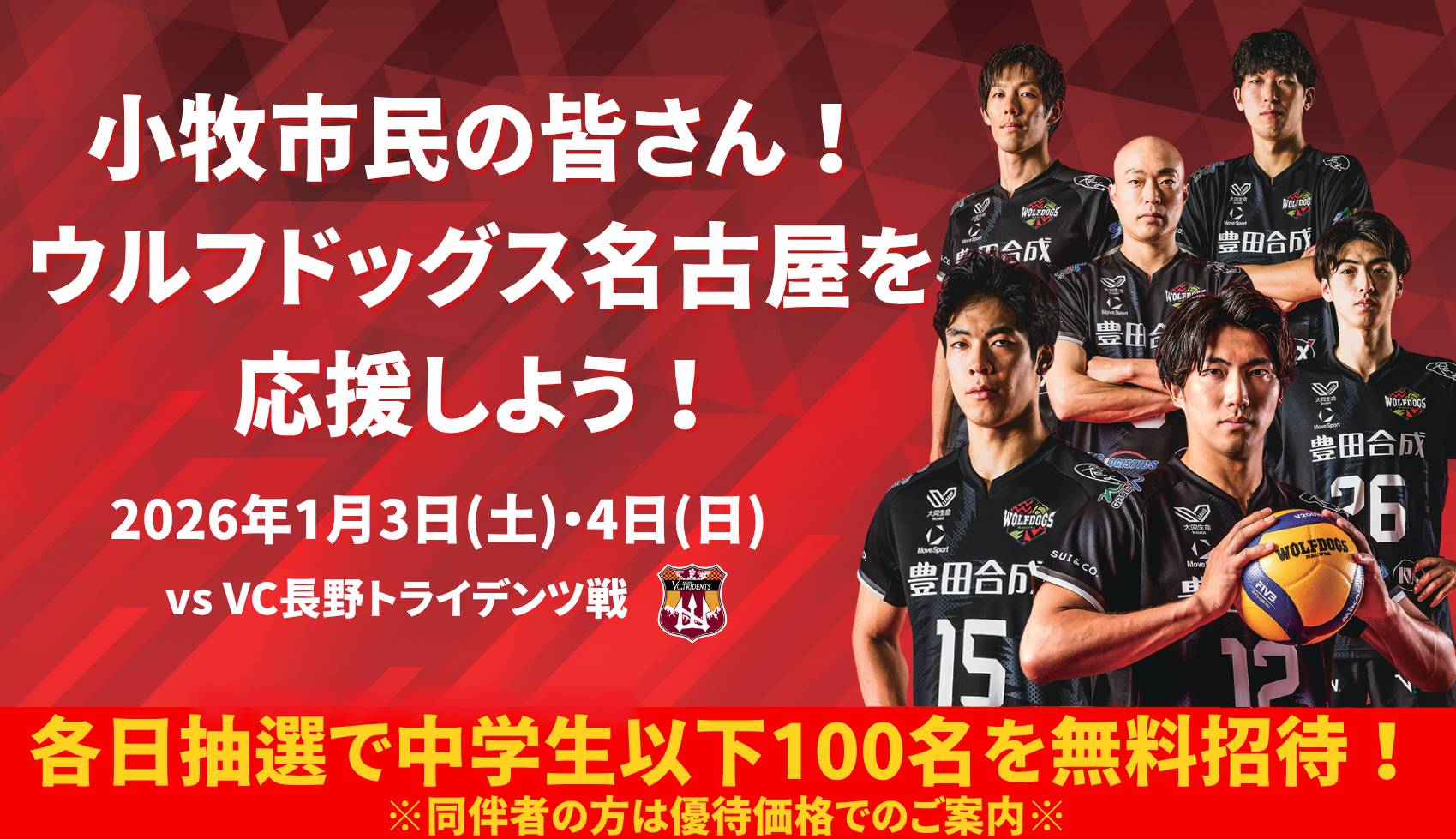 小牧市在住の中学生以下の方を対象に、各日抽選100名をホームゲームにご招待いたします!
