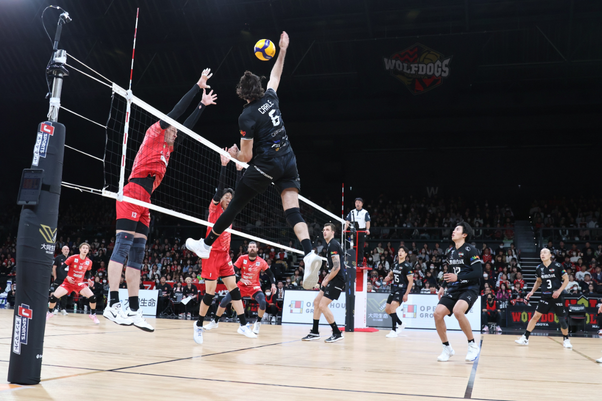 昨季SVリーグ王者のサントリーをホームに迎えたレギュラーシーズン第3節、GAME1のスタメンはセッターが深津英臣でオポジットに宮浦健人、アウトサイドヒッターはティモシー・カールと水町泰杜、ミドルブロッカーは佐藤俊一郎とノルベルト・フベルがそれぞれ対角に入った。