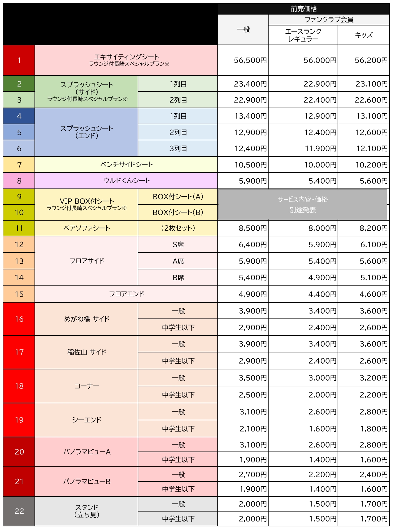 ※スペシャルシート:エキサイティングシート・スプラッシュシート・ベンチサイドシート・ウルドくんシート