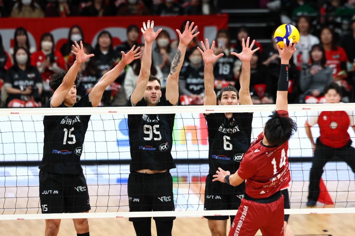 試合開始早々から4連続得点と幸先いいスタートをきると、佐藤やフベルのクイックを絡めながらアタッカー陣が満遍なく得点を重ね、第1、第2セットと相手に20点台に到達させない戦いぶりで勝利に王手をかける。だが第3セット以降はヴォレアスの積極的なサーブに崩されて思うように攻撃ができない時間帯が増え、フルセットに持ち込まれる。