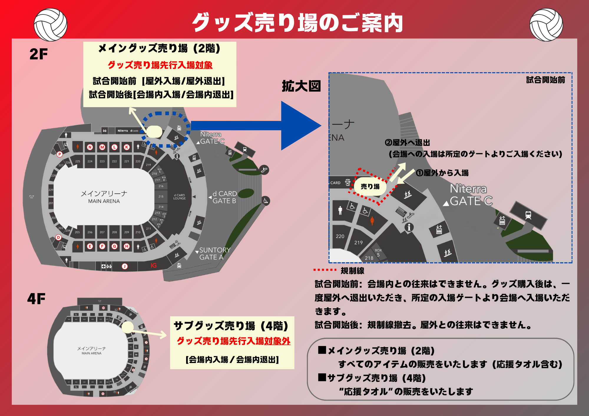 ・試合開始前は、グッズご購入後、一度屋外へ退出いただき、所定の入場ゲートより入場いただきます