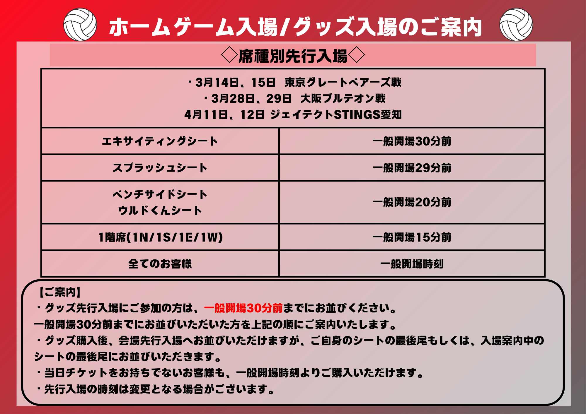 「席種別先行入場」を実施いたします。チケットの席種別に入場開始時刻を設定いたします。