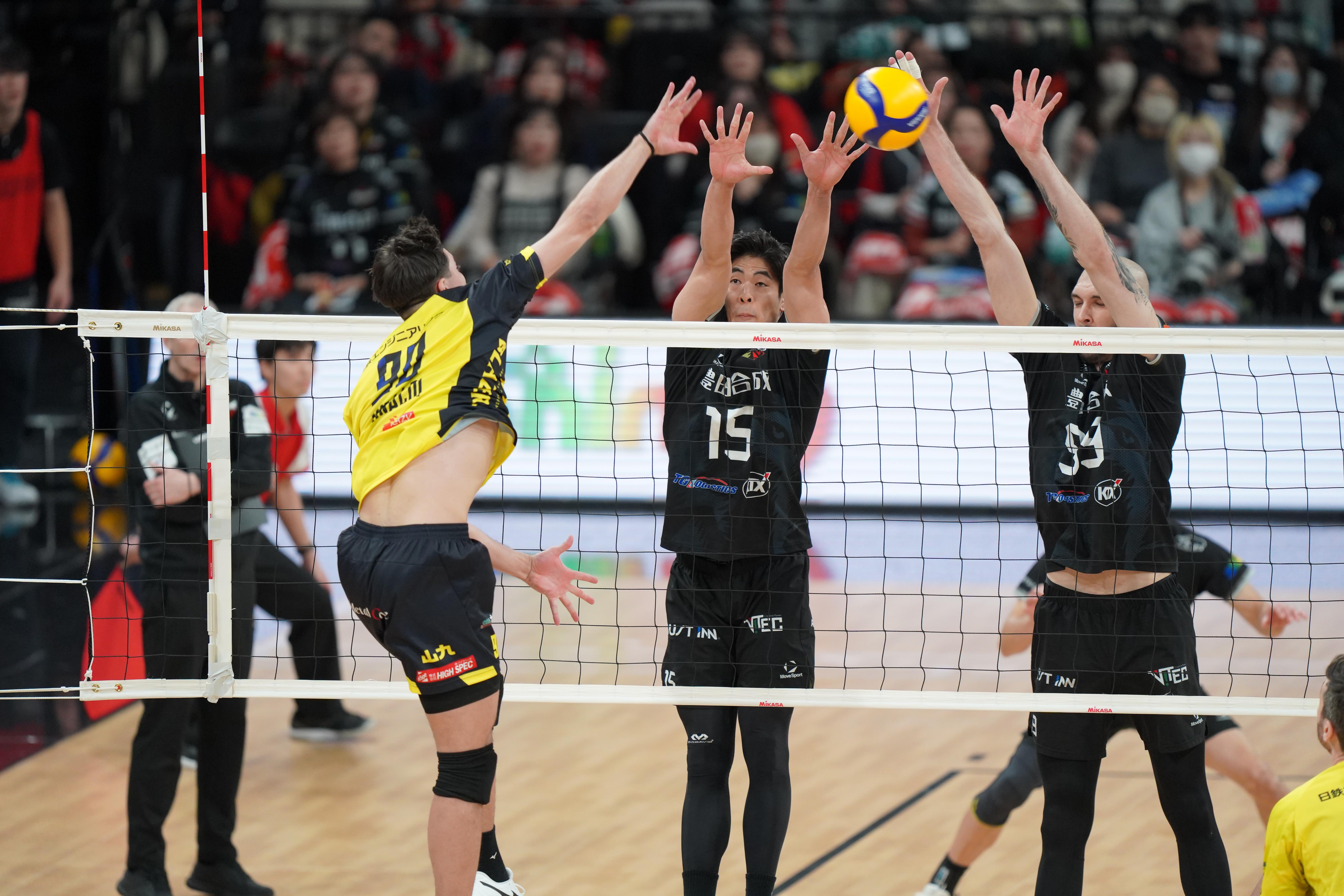 天皇杯のファイナルラウンド準々決勝で対戦した際にストレート勝ちを収めていた相手に対して、この日はフベルのブロックがさえわたる。両チームを通して最多6本のブロックシャットをマークし、日鉄堺BZの攻撃を封じ込めた。攻めては水町とエイメンの両エースが14得点と並び、水町に関してはアタック決定率が66.7%(18本中)と高い攻撃力でチームをリーグ戦再開初戦の白星へ導いた。