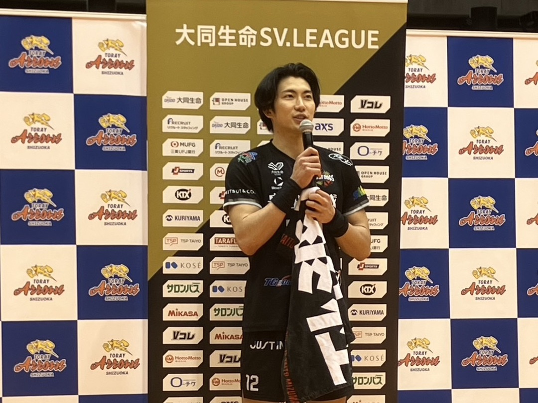 3節連続アウェーゲームの最終節、東レアローズ静岡のホームで戦うレギュラーシーズンの第14節、GAME1のスタメンはセッターが深津英臣でオポジットに宮浦健人、アウトサイドヒッターはエイメン・ブゲラと水町泰杜、ミドルブロッカーは佐藤駿一郎とノルベルト・フベルがそれぞれ対角に入った。