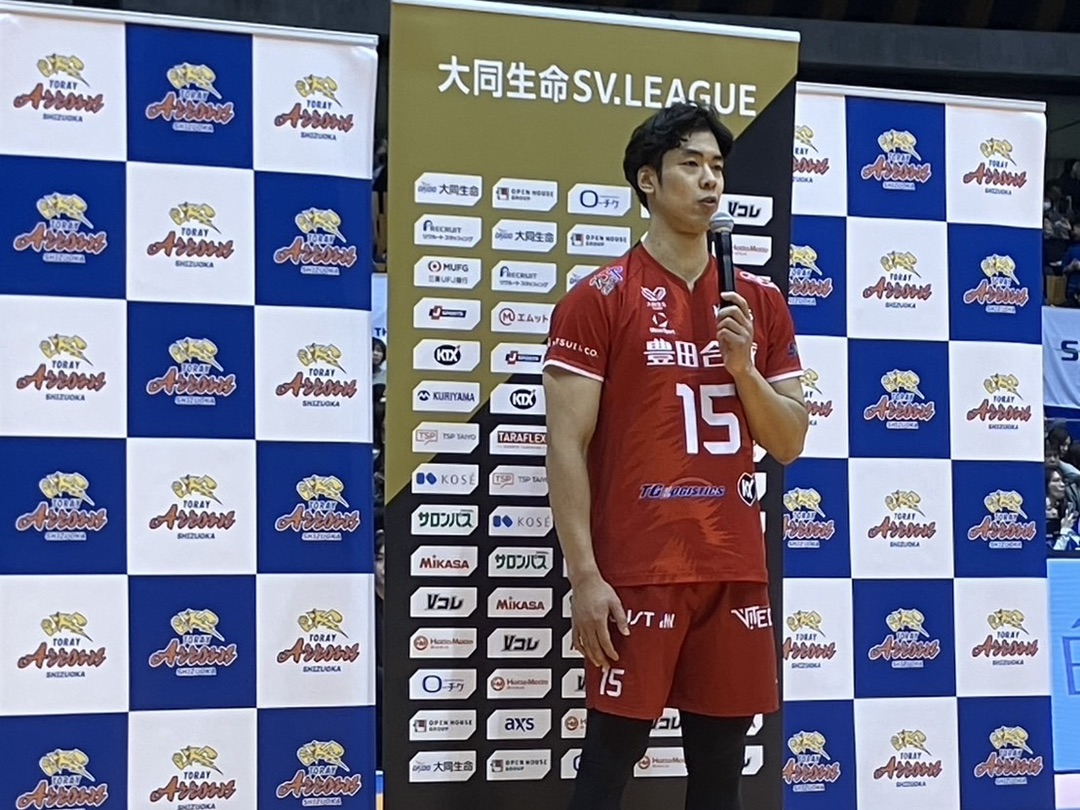 東レアローズ静岡のホームで戦うレギュラーシーズンの第14節、GAME2のスタメンはセッターが深津英臣でオポジットに宮浦健人、アウトサイドヒッターはティモシー・カールとエイメン・ブゲラ、ミドルブロッカーは佐藤駿一郎と傳田亮太がそれぞれ対角に入った。