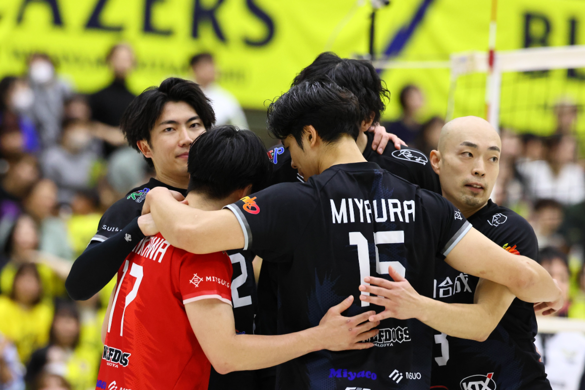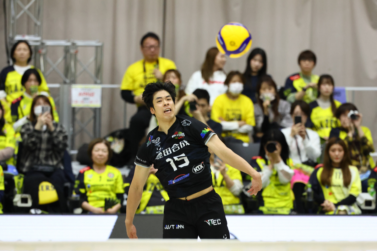 続く第2セット早々にはトランジションアタックでコンビが合わずに失点。この場面について「相手に昨季までWD名古屋でプレーしていた高梨健太選手がいたので、声を出してサインを伝えると聞こえてしまうと思いました。なので、小声で深津選手に伝えたのですが、それがうまく届いていなかった」と振り返った宮浦。けれども、すぐに切り替えて最大3点のビハインドも12-14から4連続得点で逆転し、終盤にはカールがサービスエースを決めてマッチポイントに到達。最後は相手のサーブミスで勝利に王手をかける。